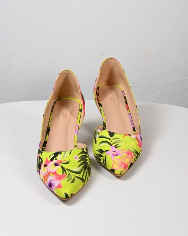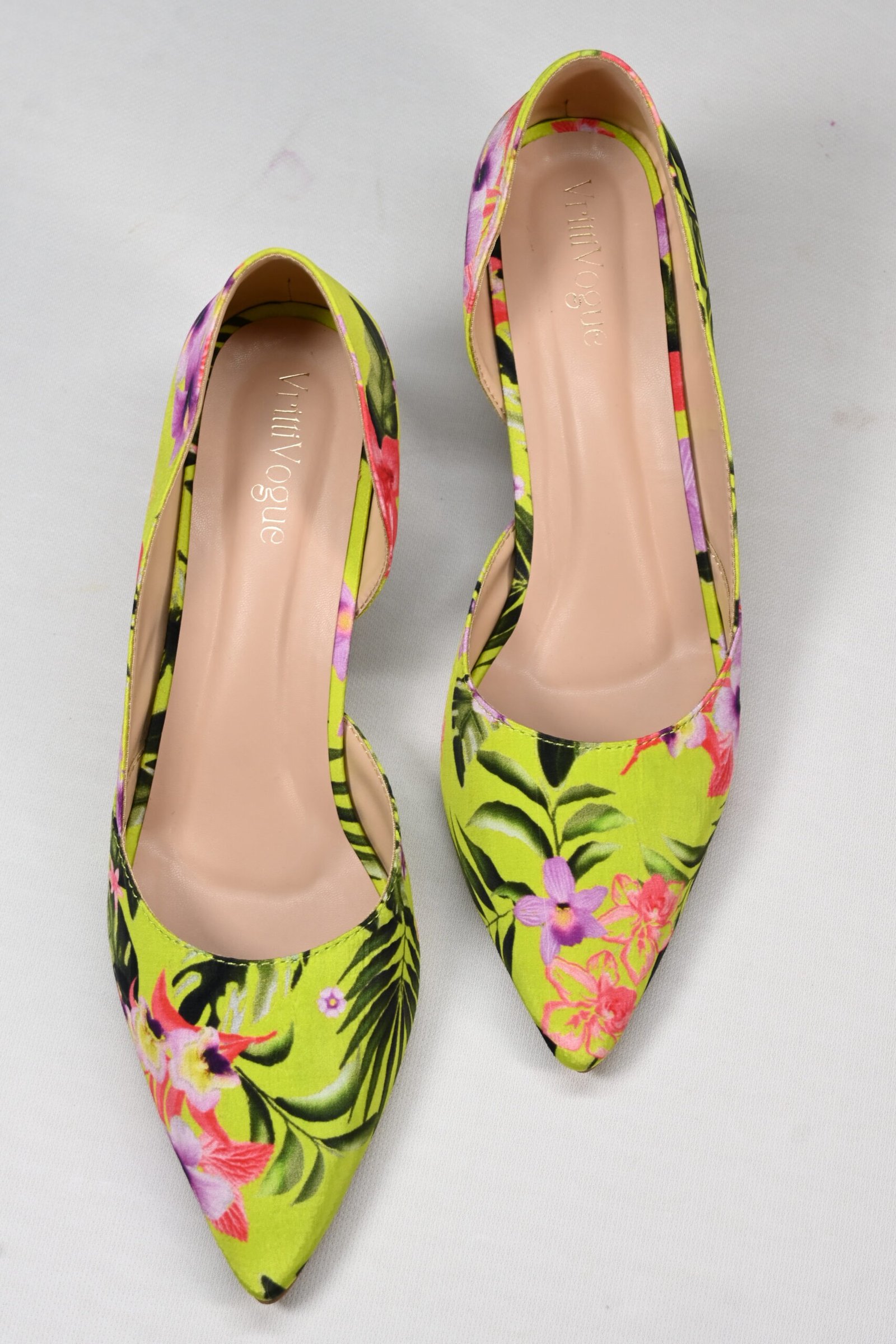 Bring the beach to your feet with these radiant 2-inch slip-on heels in vibrant neon yellow floral print fabric. Inspired by sun-drenched shores and tropical escapes, this pair captures the spirit of summer with every step.