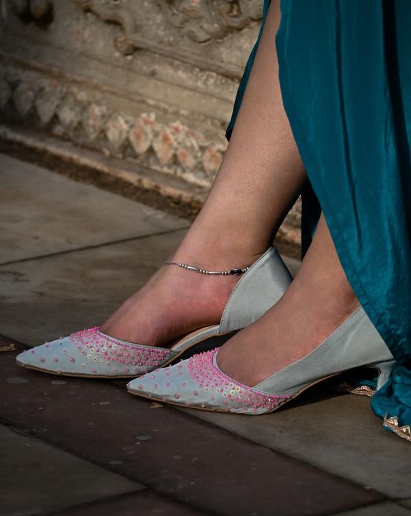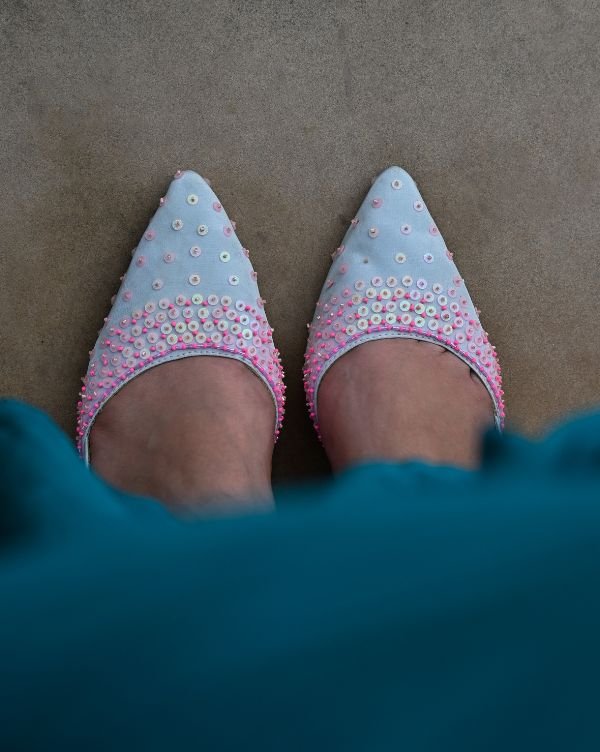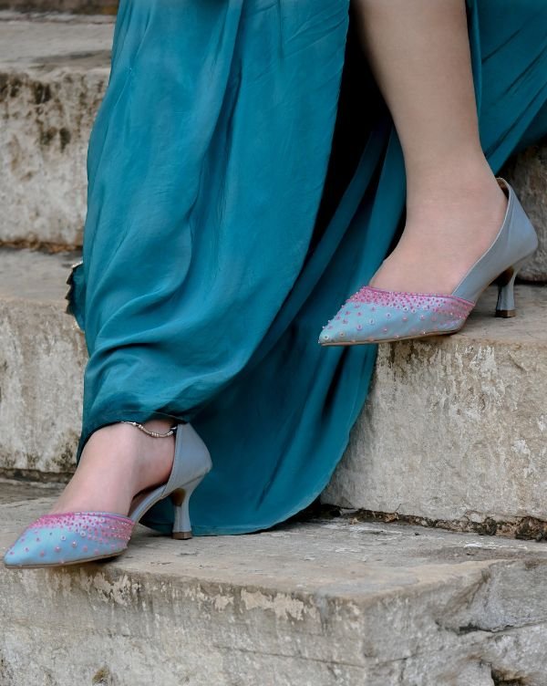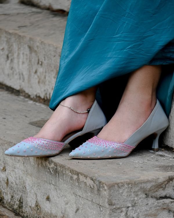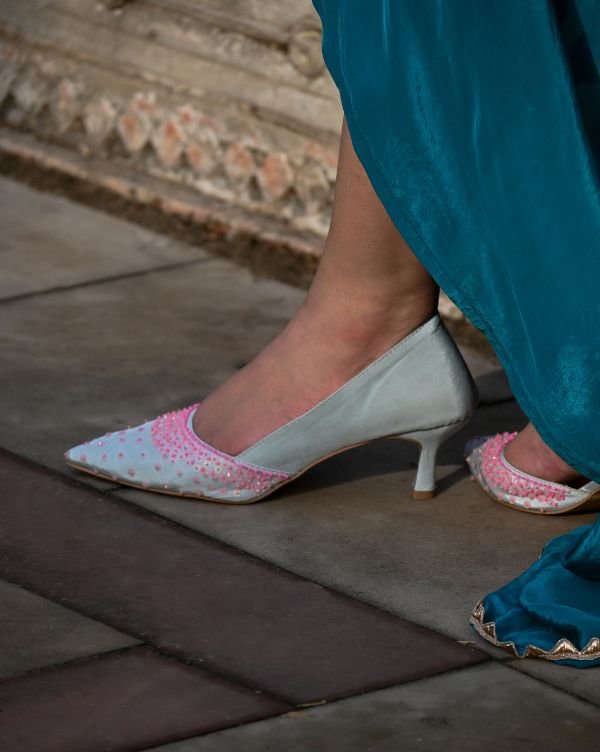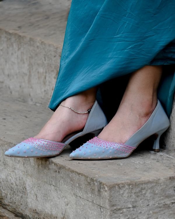 Step into subtle sophistication with our Powder Blue & Pink Slip-On Heels, beautifully designed for women who appreciate fine detailing and effortless comfort. These pointed-toe heels feature a powder blue base adorned with hand-embroidered pink beadwork, making each pair a unique piece of wearable art.