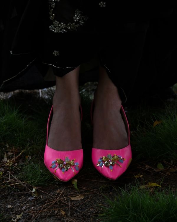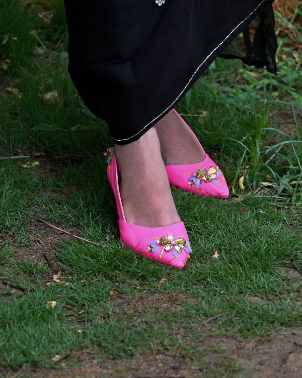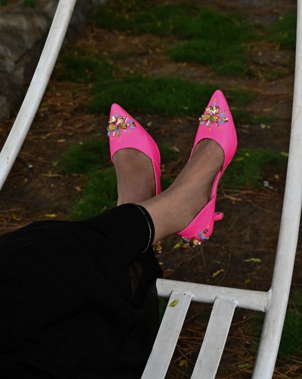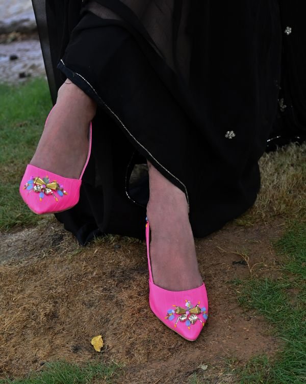 Bring the spotlight to your feet with these striking Neon Pink Heels, designed for fearless fashion lovers. Hand-decorated with a mix of golden metallic and royal blue ornaments, this pair is made to dazzle — whether you’re heading to a sangeet, cocktail party, or styled in a chic Indo-western look.