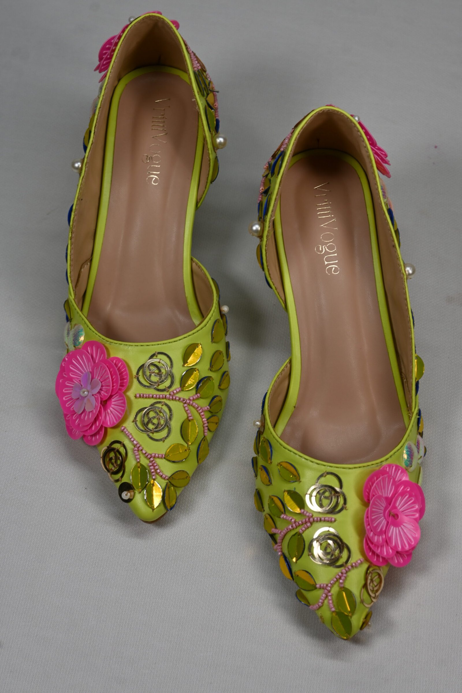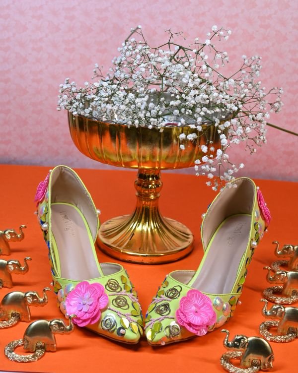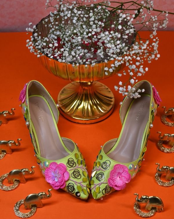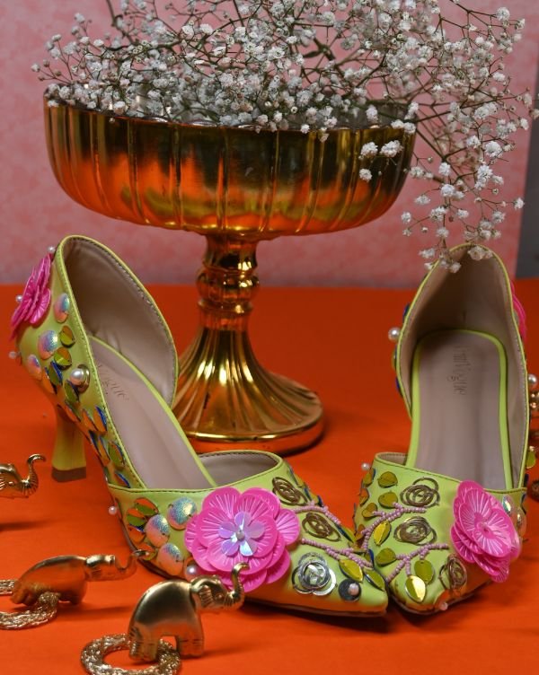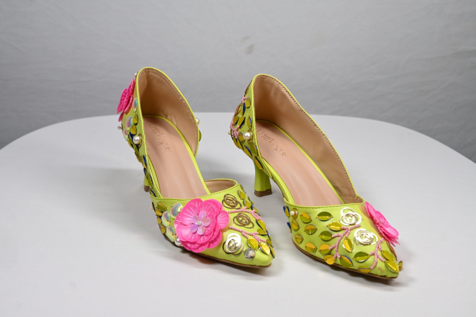 Step into bold brilliance with these 2-inch slip-on heels, wrapped in a vibrant, zesty green fabric that catches the eye without saying a word. Crafted from premium man-made leather, this pair is elevated with neon pink handcrafted fabric flowers, delicate single-leaf embellishments, light pink bead clusters, and gleaming metallic rings that bring an artful edge to every step.