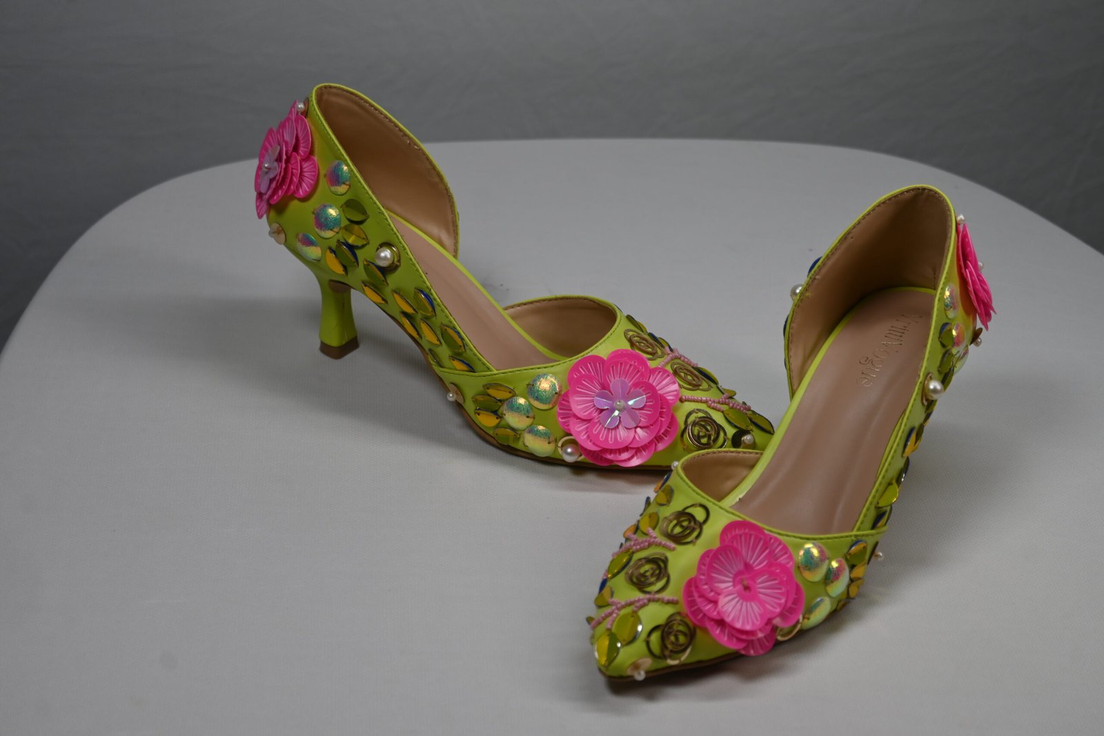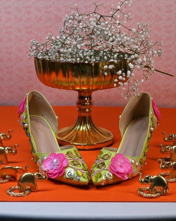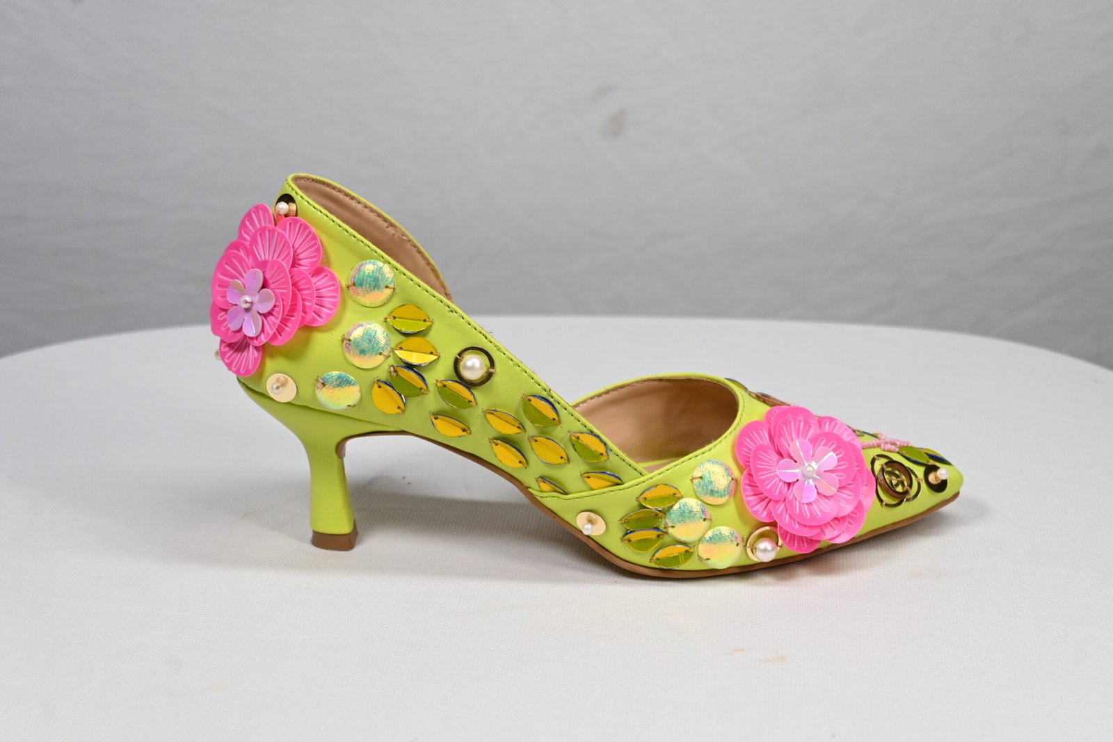 Step into bold brilliance with these 2-inch slip-on heels, wrapped in a vibrant, zesty green fabric that catches the eye without saying a word. Crafted from premium man-made leather, this pair is elevated with neon pink handcrafted fabric flowers, delicate single-leaf embellishments, light pink bead clusters, and gleaming metallic rings that bring an artful edge to every step.