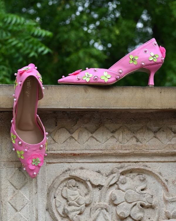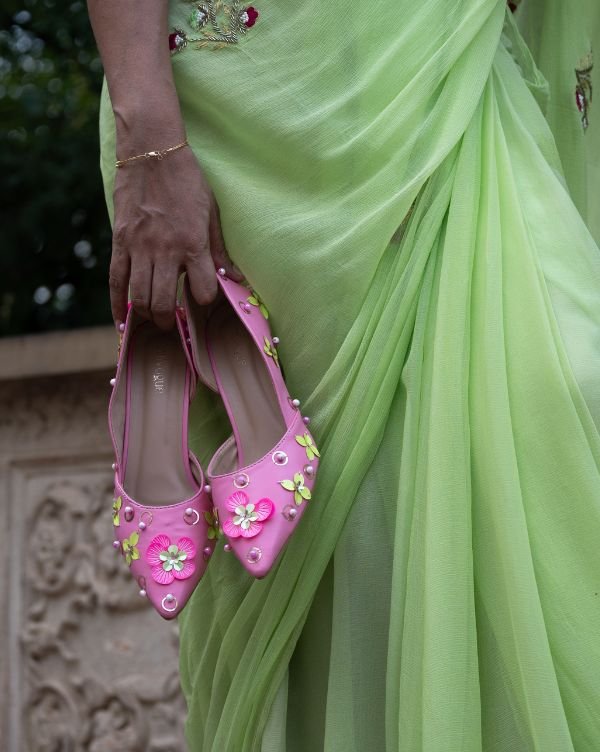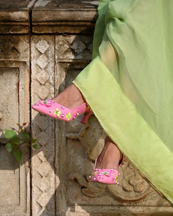 Step into elegance with our Lavender Rose Heels, designed for those who embrace subtle tones with standout detailing. Embellished with fuchsia pink and green ornamental findings, these heels blend modern artistry with festive flair, making them the perfect pair for daytime weddings, mehendi functions, or statement fusion looks.