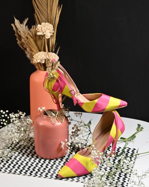Add a burst of playful elegance to your step with our 3.5-inch statement heels, crafted in a vibrant pink and yellow fabric. These heels are adorned with ornamental butterflies, gold-toned hoops, and layered chains, creating a dreamy, eclectic charm that turns heads wherever you go.